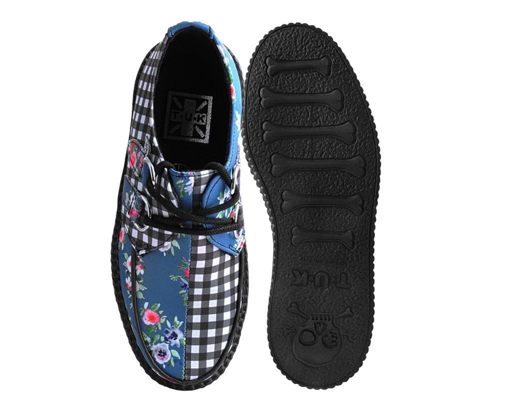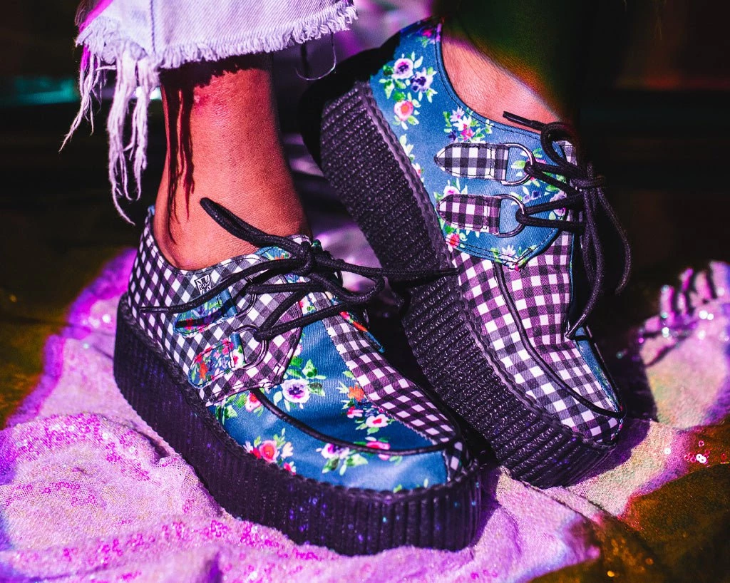 New shoes in bloom. Our lightweight Viva mondo sole is approximately 1 3/4” at the heel and 1 1/4” in the front. Has removable memory foam insoles for added comfort. Features a mixed pattern of floral and gingham fabric upper. These round toe creepers have silver metal D-rings and features our patented T.U.K. Skull n’ Bones creeper sole design.