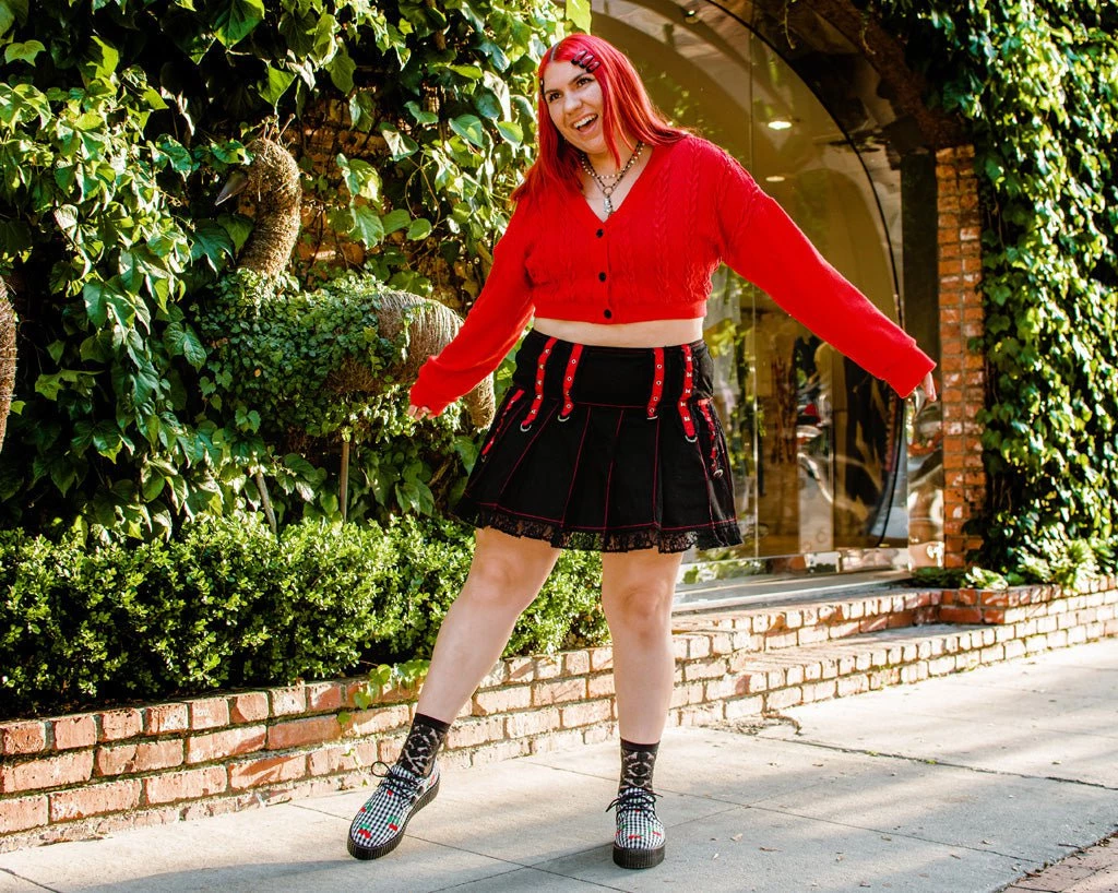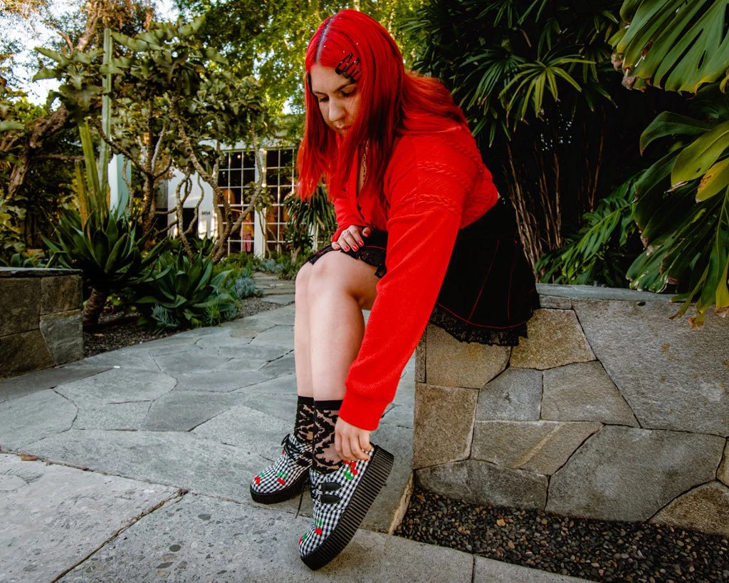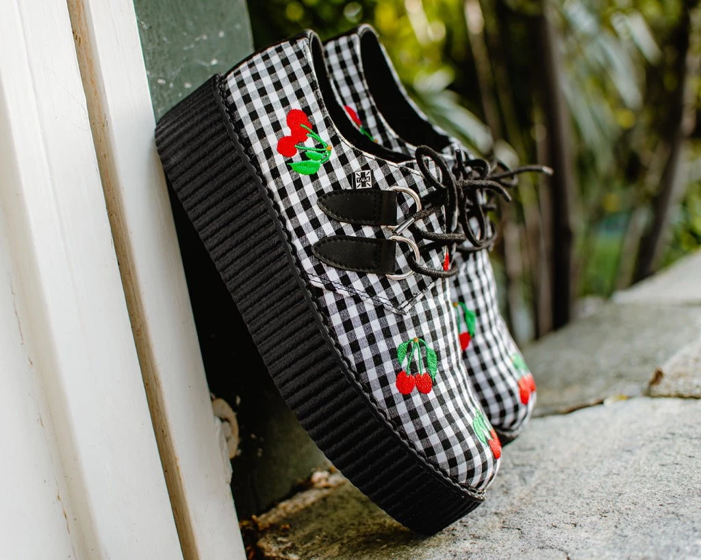 With a cherry on top. Our lightweight Viva mondo sole is approximately 1 3/4” at the heel and 1 1/4” in the front. Has removable memory foam insoles for added comfort. Features a gingham fabric upper with red embroidered cherries. These round toe creepers have silver metal D-rings and features our patented T.U.K. Skull n’ Bones creeper sole design.