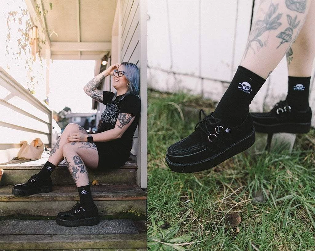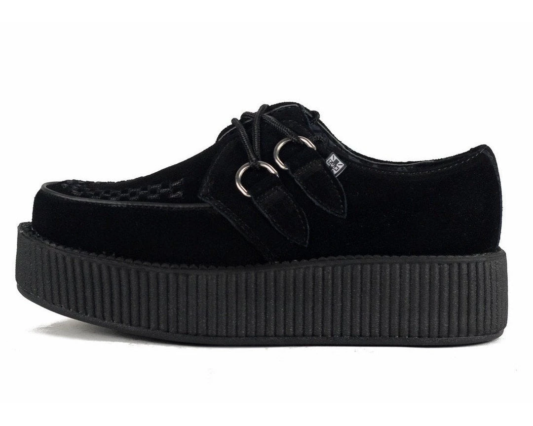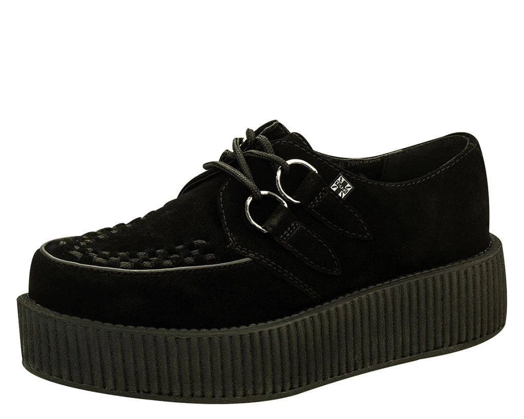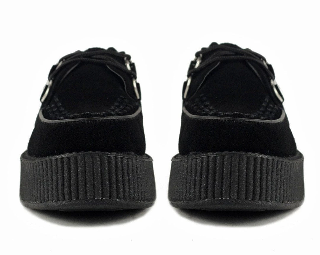 The Classics Never Go Out Of Style. These black suede T.U.K. Mondo Sole Viva Creepers feature the new lightweight and more flexible soles in our traditional 1 7/8″ height. These round toe creepers have a black woven interlace, and silver metal D-rings on our patented T.U.K. Skull n’ Bones creeper sole design.