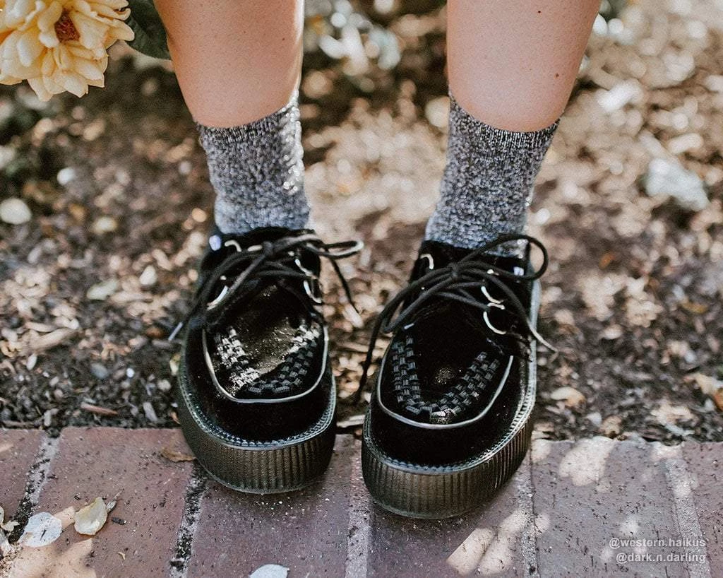 A luxe update and vegan friendly alternative to one of our bestselling classic creeper styles. Features a rich, black velvet upper that sits on top of our lightweight VIVA mondo sole that has a platform height approximately 1 ¾” at the heel and 1 ¼” in the front. Has removable memory foam padding for added comfort.