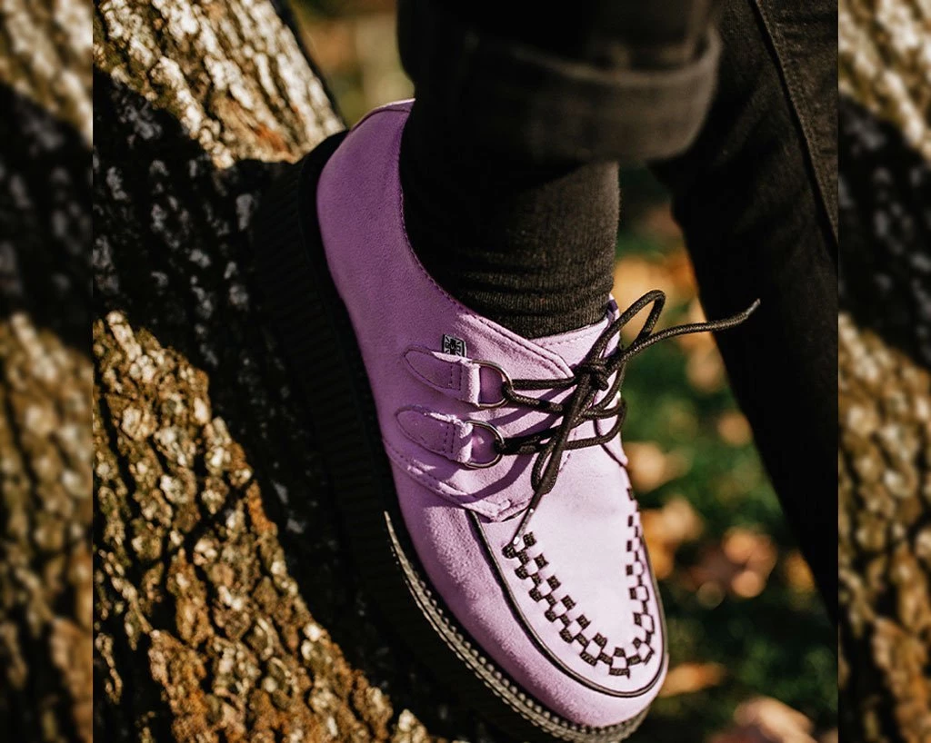 Add some lavender love to your day with these purple faux suede T.U.K. Viva Mondo Creepers. Our lightweight Viva mondo sole is approximately 1 3/4” at the heel and 1 1/4” in the front. Has removable memory foam insoles for added comfort. These round toe creepers have a black woven interlace, and silver metal D-rings on our patented T.U.K. Skull n’ Bones creeper sole design.