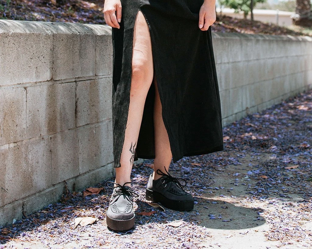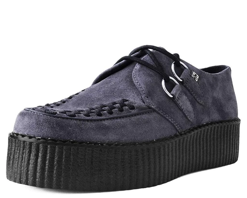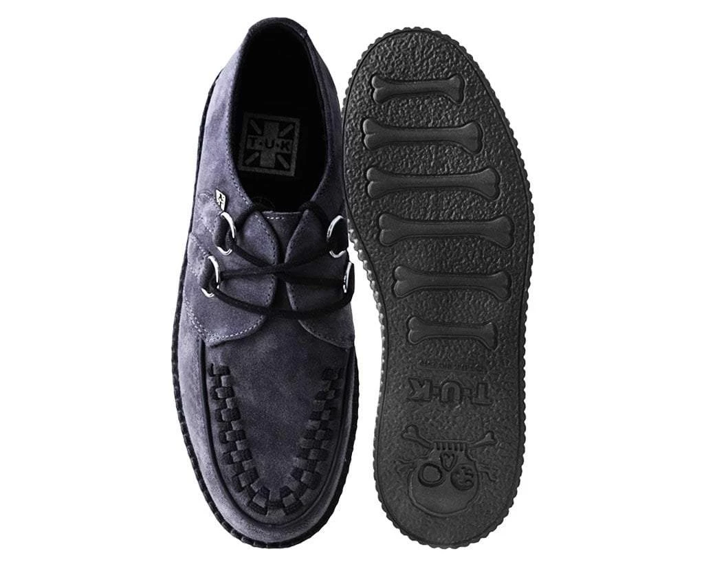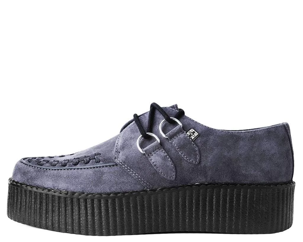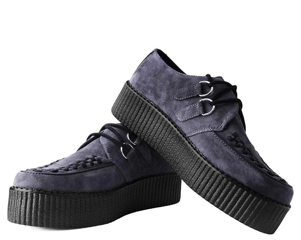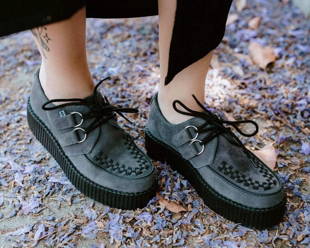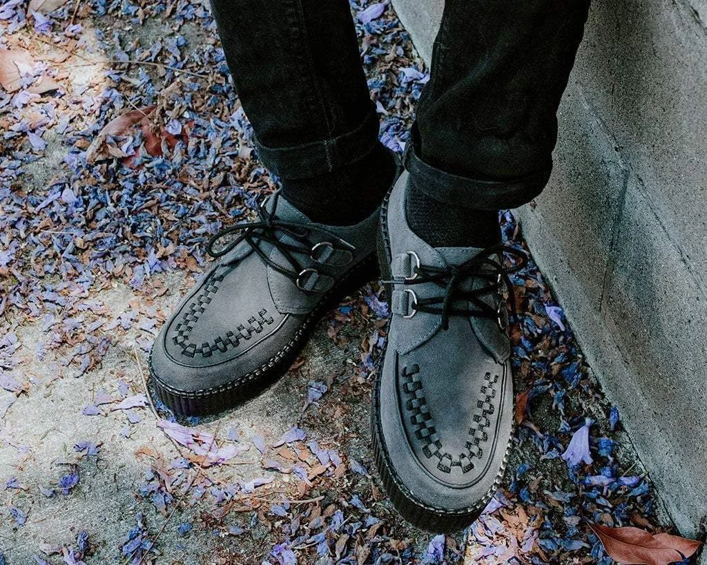 Classic kicks with a twist. These grey suede round toe Creepers feature the new lightweight and more flexible soles in our traditional 1 7/8″ height. Constructed with a black woven interlace, and silver metal D-rings for lace up on our patented T.U.K. Skull n’ Bones creeper sole design.