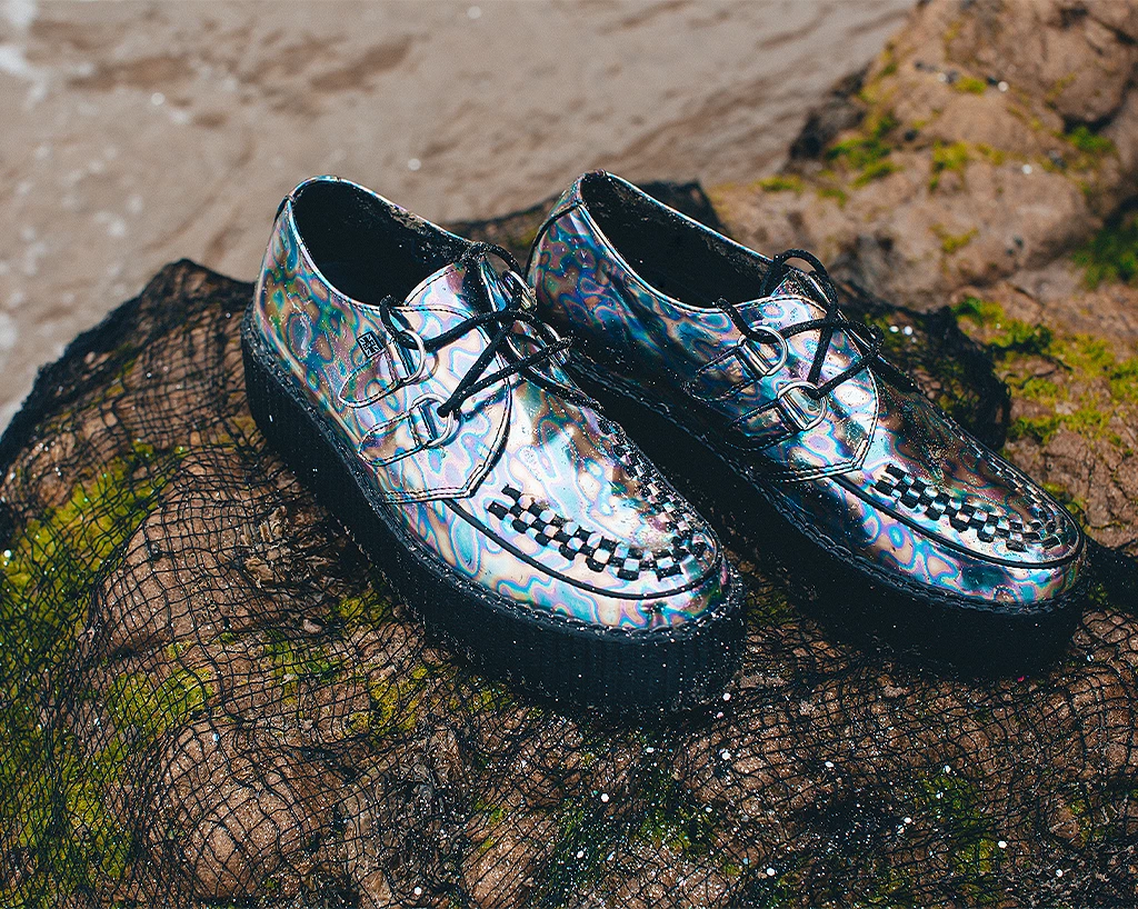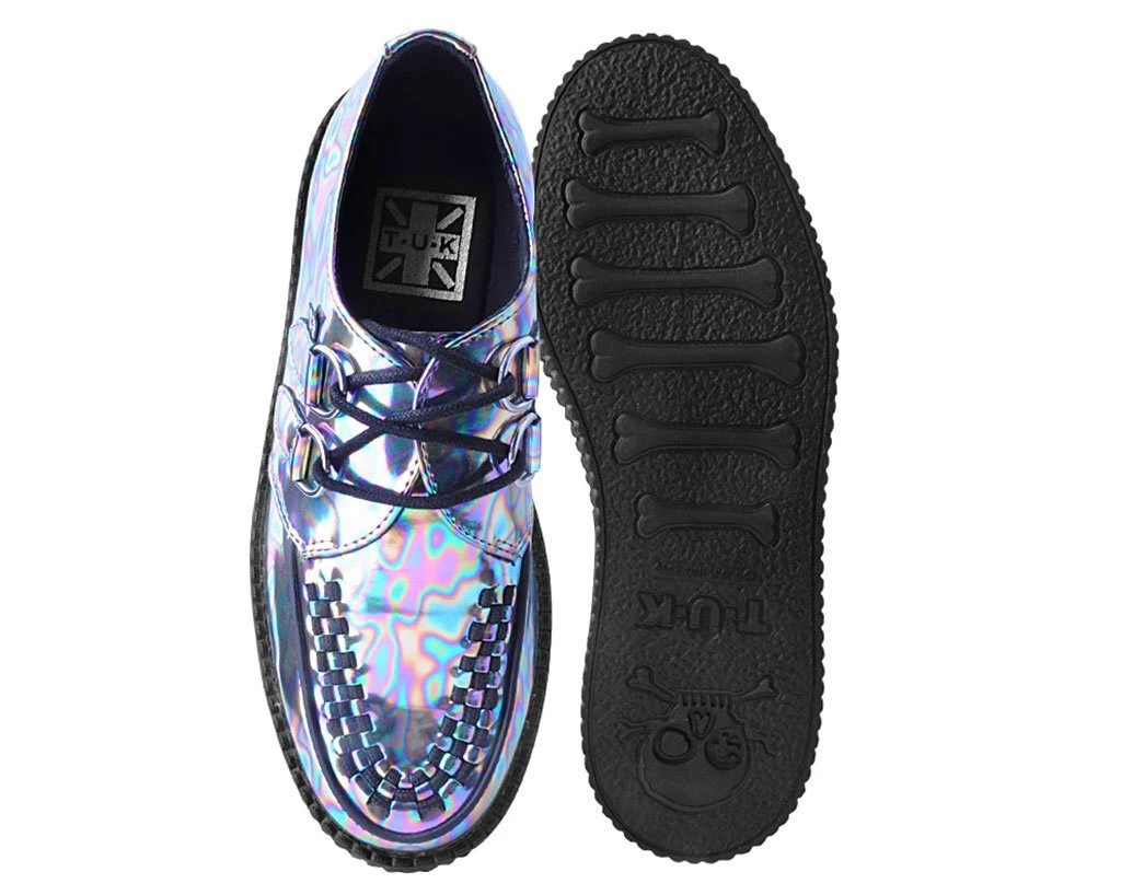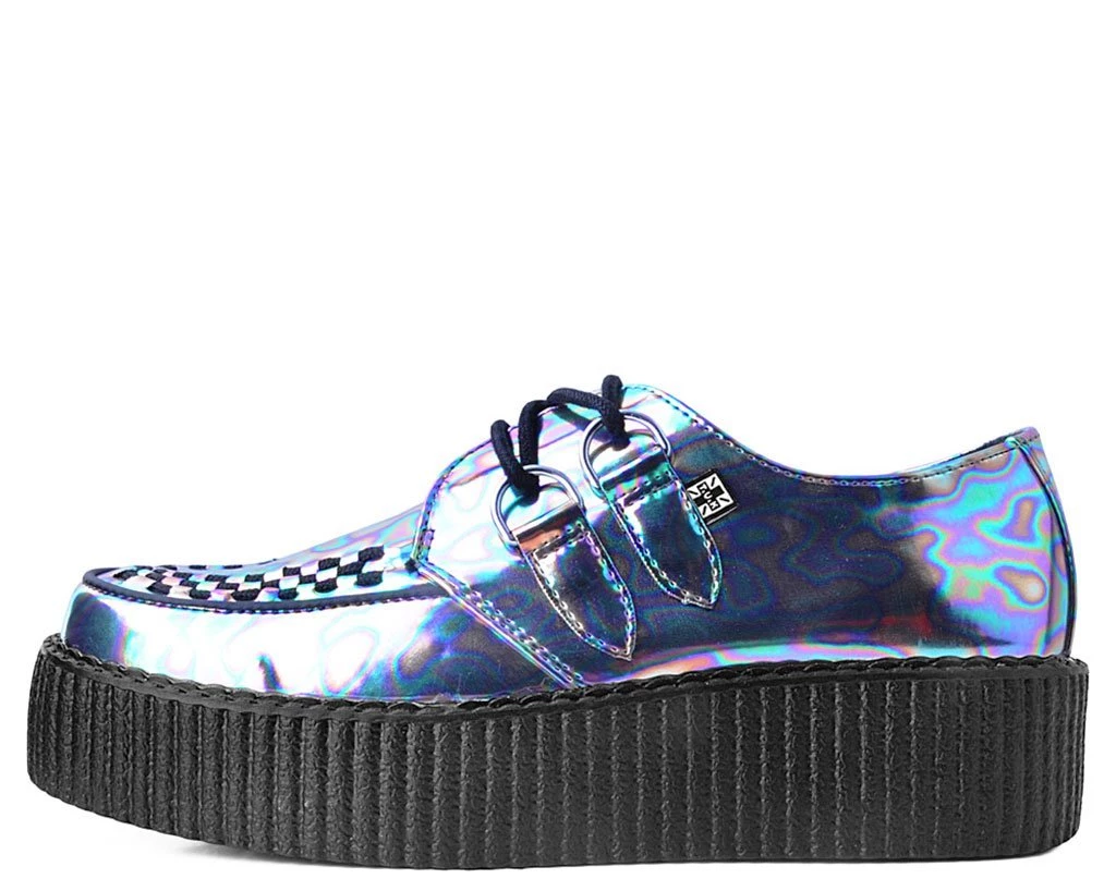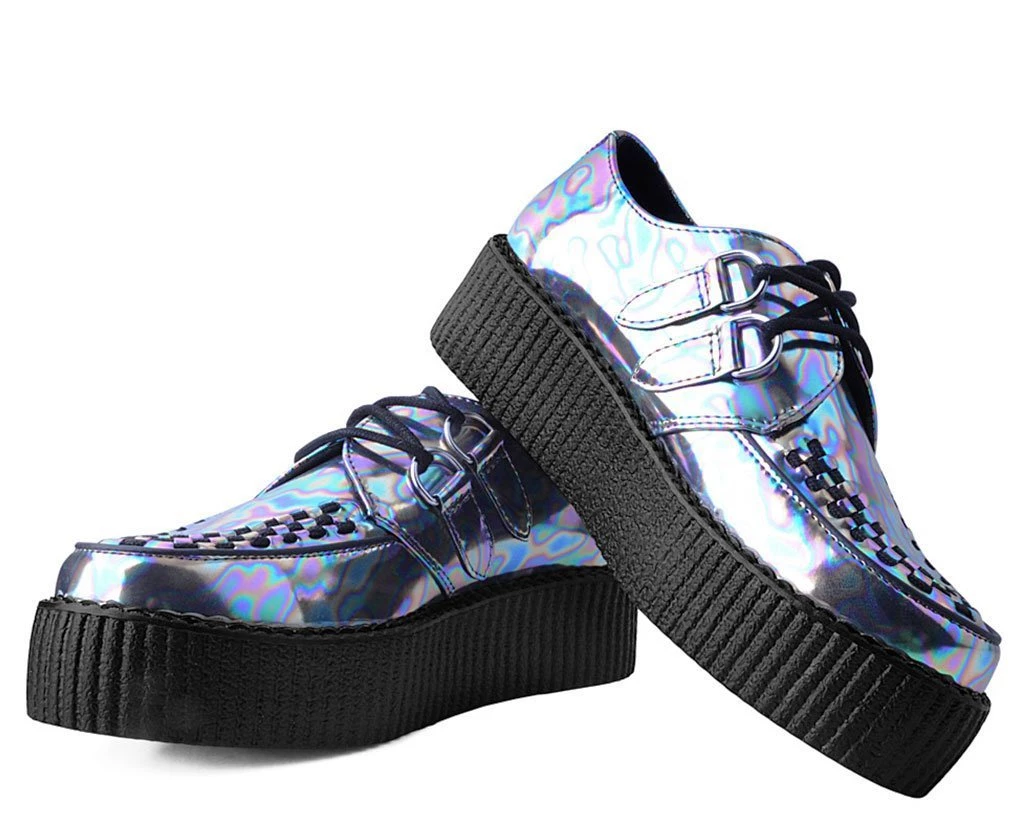 Make an entrance with these iridescent round toe creepers. Features an interlace on the vamp, lace-up fastening, and our lightweight VIVA mondo sole that is approximately 1 3/4” at the heel and 1 1/4” in the front. Has removable memory foam padding for added comfort. Shoe can be easily cleaned with mild soap and water.