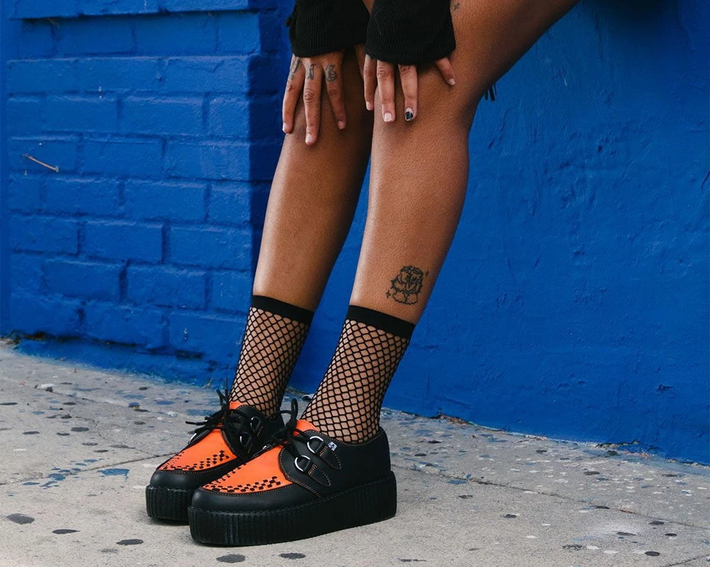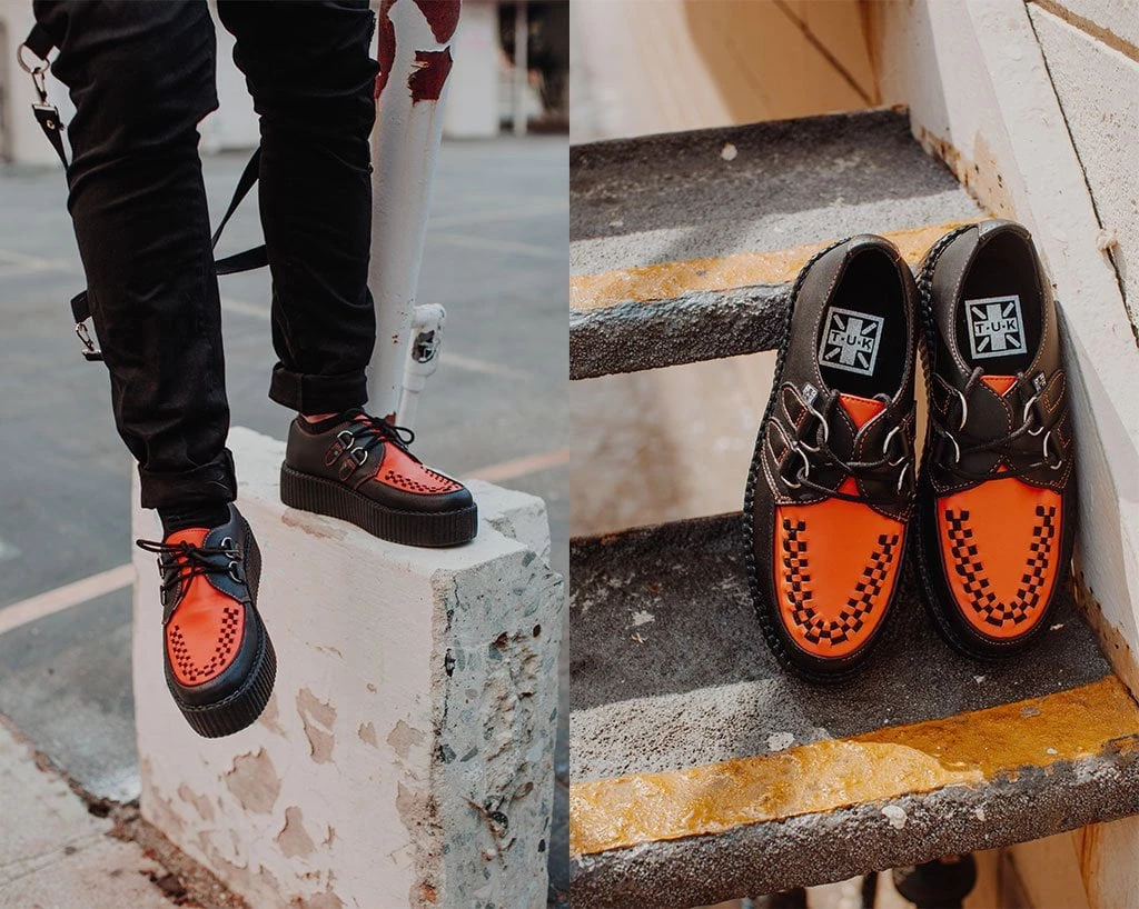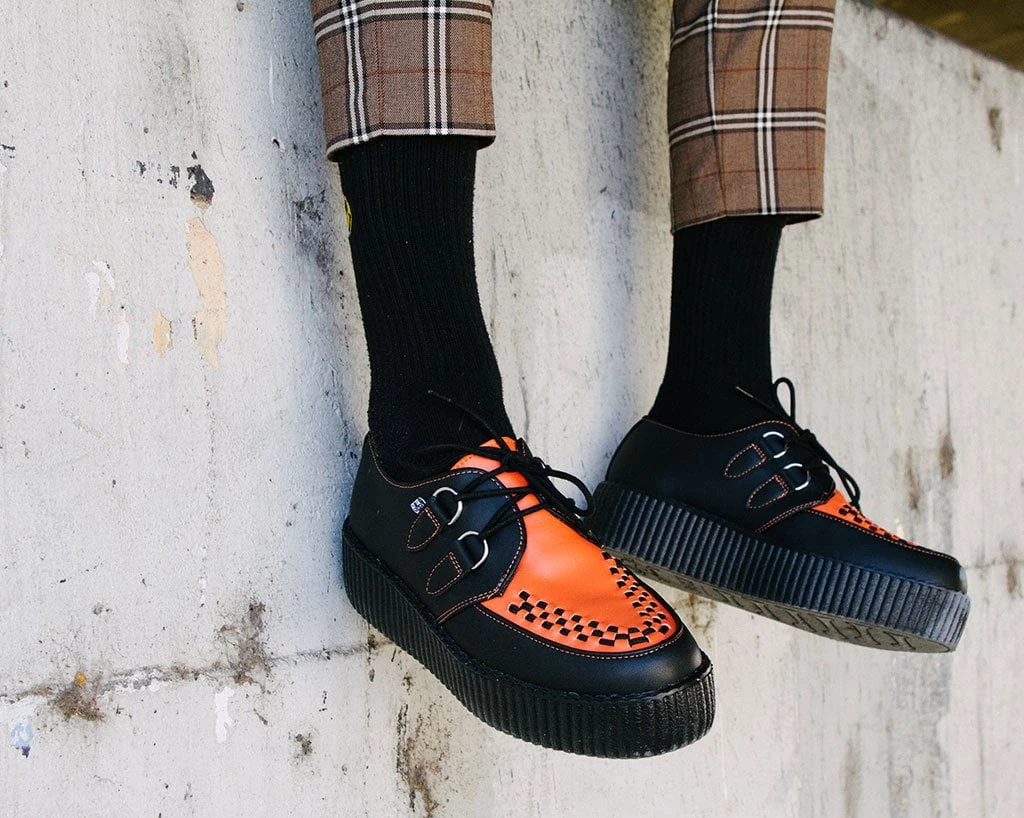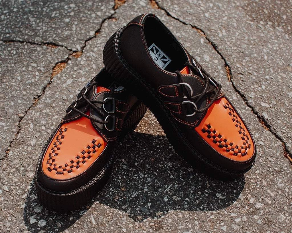 Set the standards with these classic round toe creepers that offers our same bold, iconic style in a vegan alternative option. Has a black upper contrasted with burnt orange on the vamp made of our high quality TUKskin™ material — polishable synthetic faux leather that is both soft and breathable. Features black woven interlace detailing, orange stitching, lace-up fastening, and our lightweight VIVA mondo sole that is approximately 1 ¾” at the heel and 1 ¼” in the front. Has removable memory foam padding for added comfort. Shoe can be easily cleaned with mild soap and water.