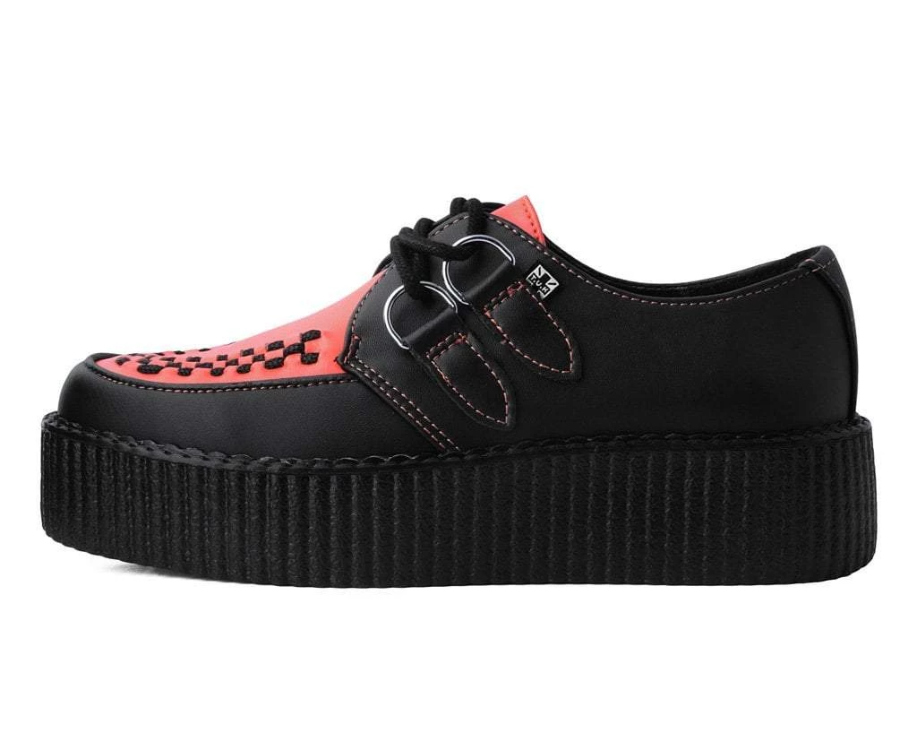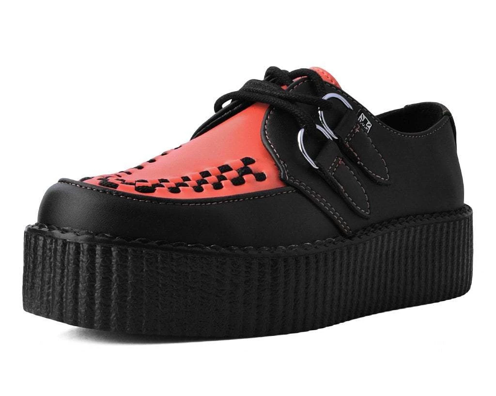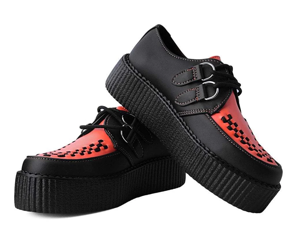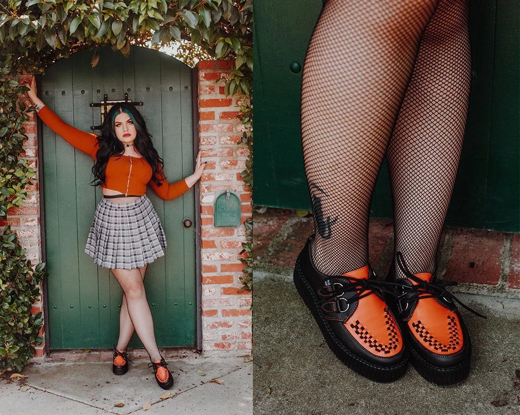 Set the standards with these classic round toe creepers that offers our same bold, iconic style in a vegan alternative option. Has a black upper contrasted with burnt orange on the vamp made of our high quality TUKskin™ material — polishable synthetic faux leather that is both soft and breathable. Features black woven interlace detailing, orange stitching, lace-up fastening, and our lightweight VIVA mondo sole that is approximately 1 ¾” at the heel and 1 ¼” in the front. Has removable memory foam padding for added comfort. Shoe can be easily cleaned with mild soap and water.