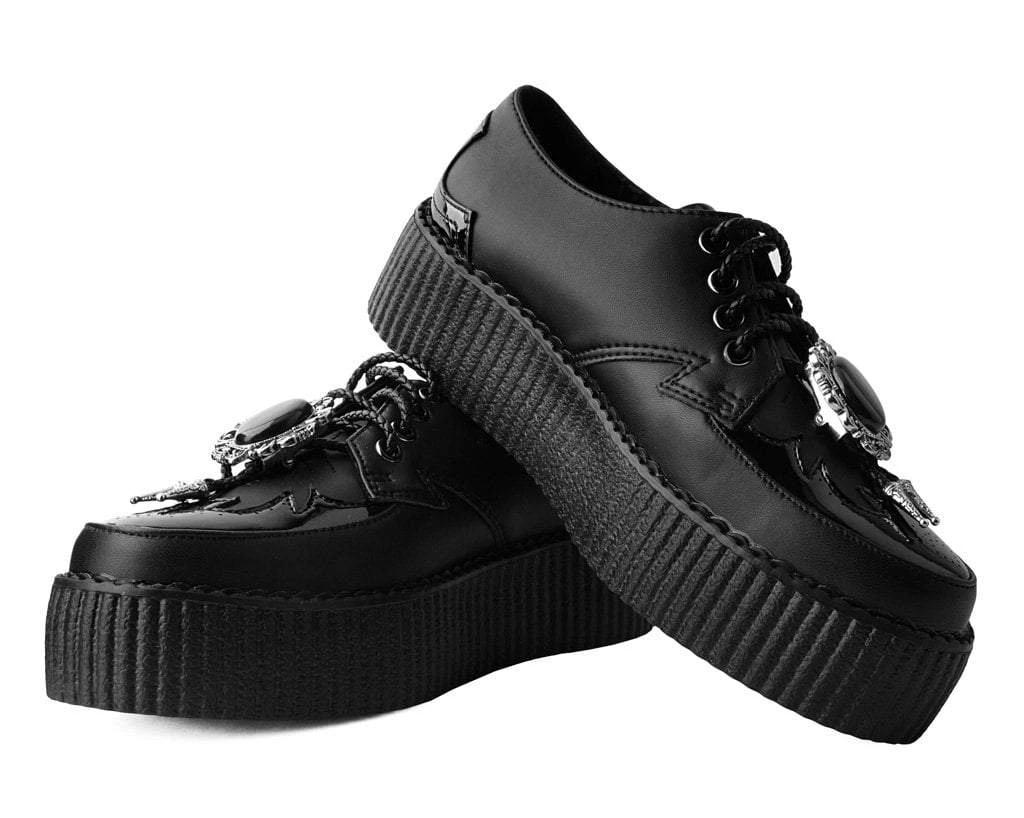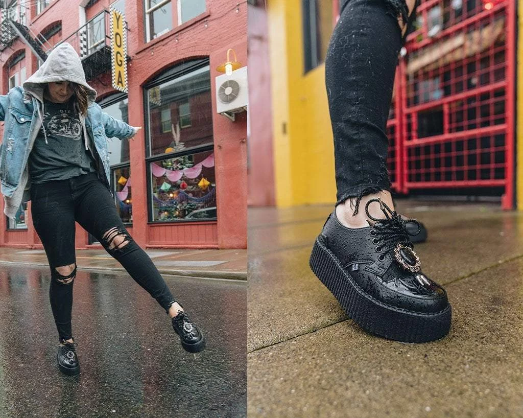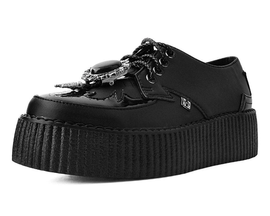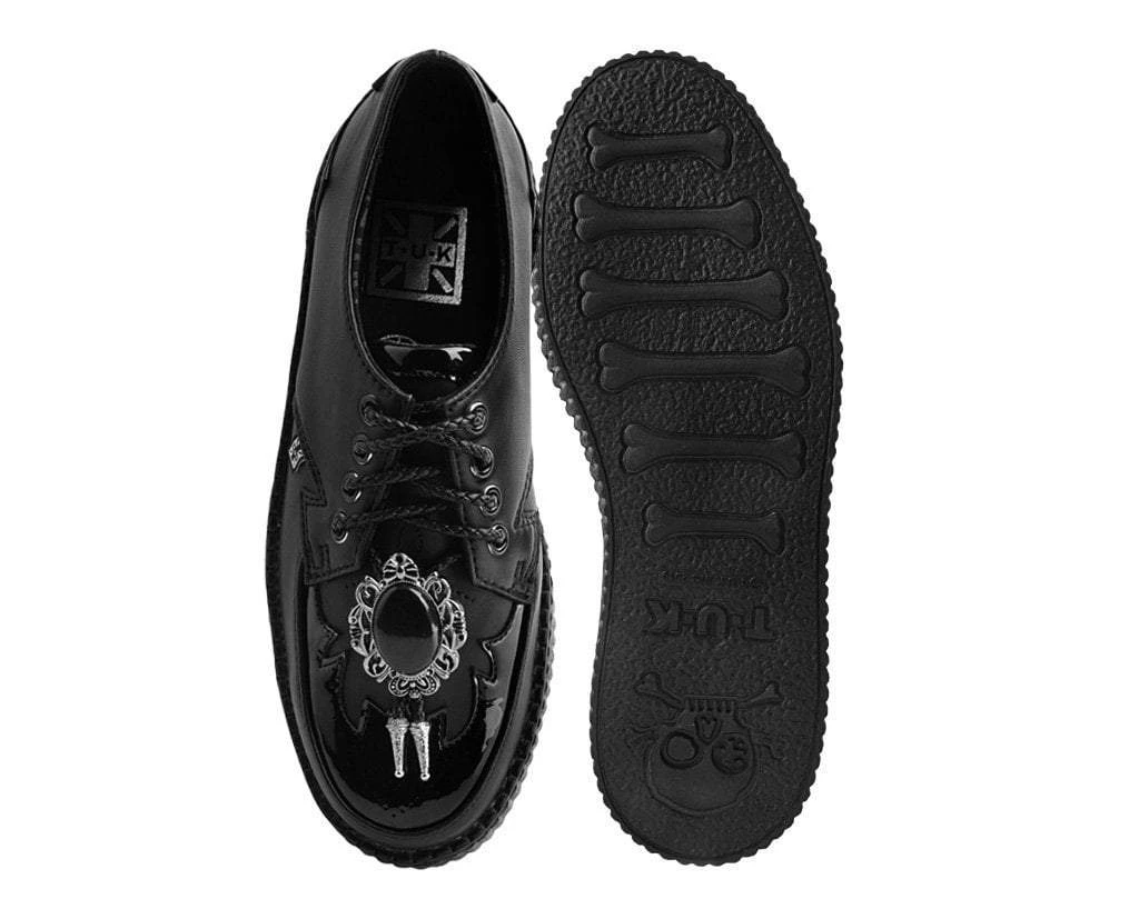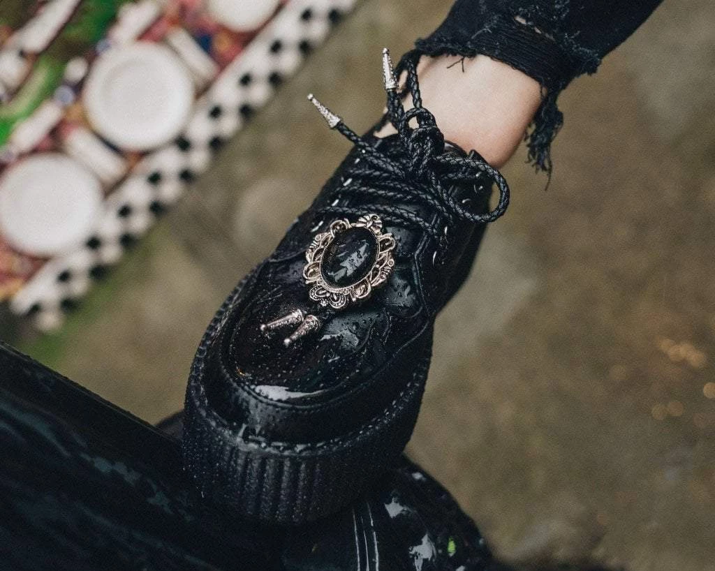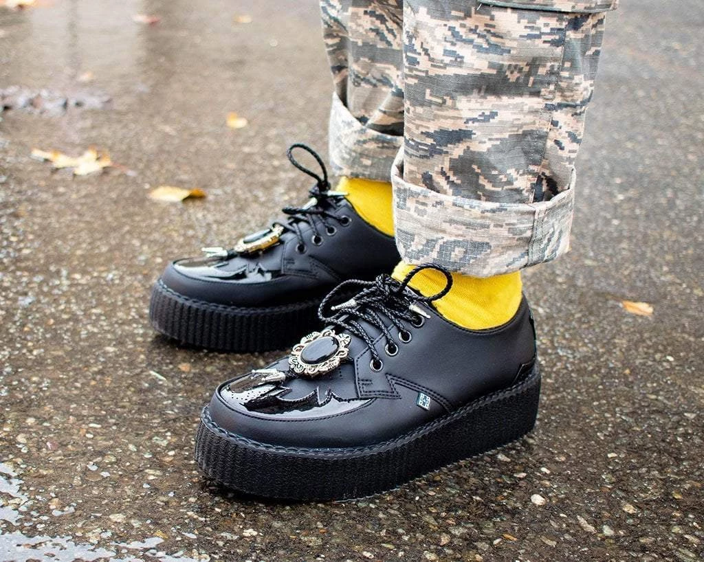 Step up your shoe game with these creepers that have bolo tie laces. Has an all-black upper that features both patent and our high quality TUKskin™ material — polishable synthetic faux leather that is both soft and breathable. Laces are not removable and cannot be replaced. Features black woven interlace detailing, lace-up fastening, and our lightweight VIVA mondo sole that is approximately 1 ¾” at the heel and 1 ¼” in the front. Has removable memory foam padding for added comfort. Shoe can be easily cleaned with mild soap and water.