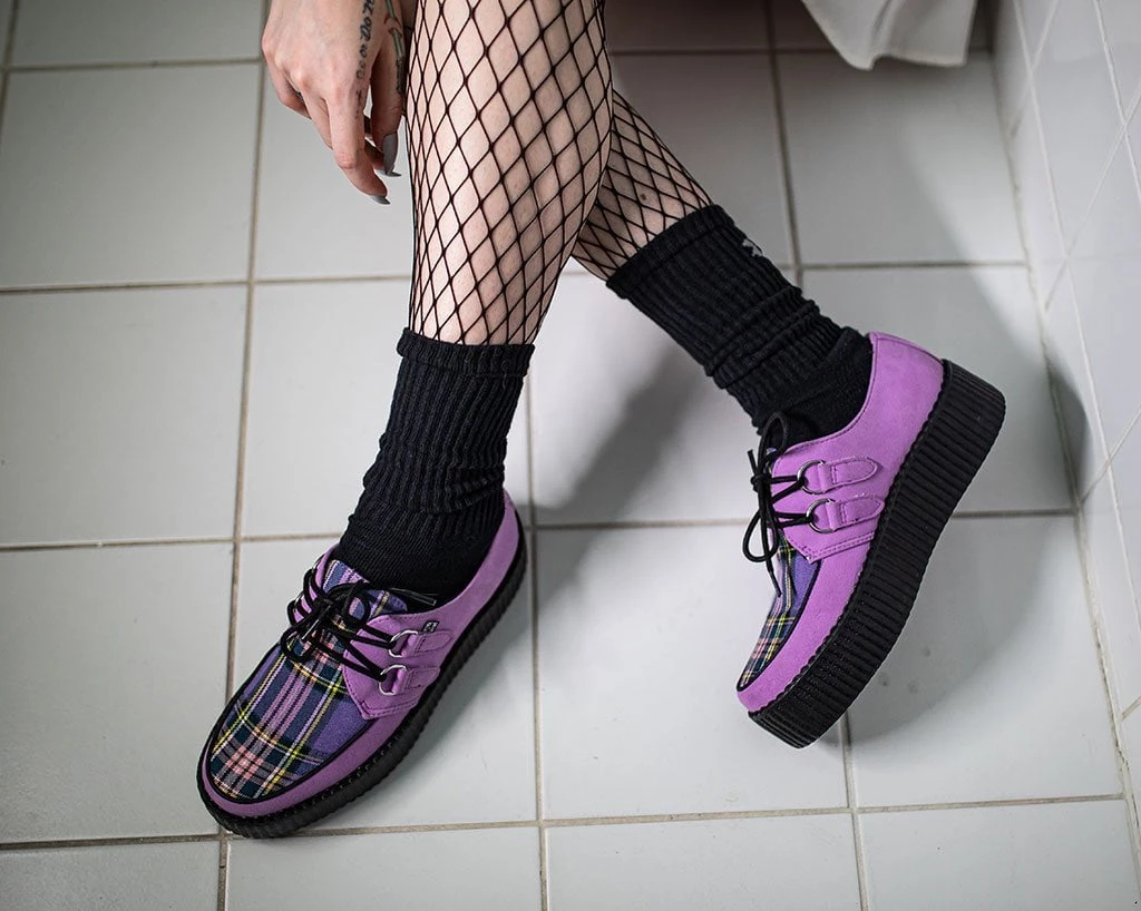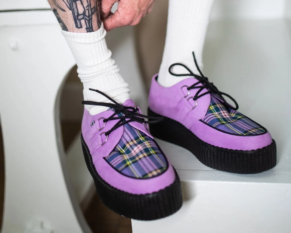 For those classic creeper lovers. Features tartan fabric apron, lace-up fastening, and our lightweight VIVA mondo sole that is approximately 1 ¾” at the heel and 1 ¼” in the front. Has a lavender microfiber upper. Includes a removable memory foam insoles for added comfort.