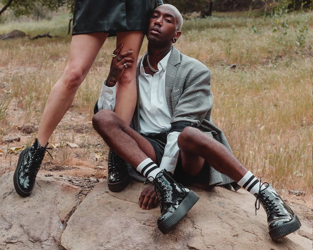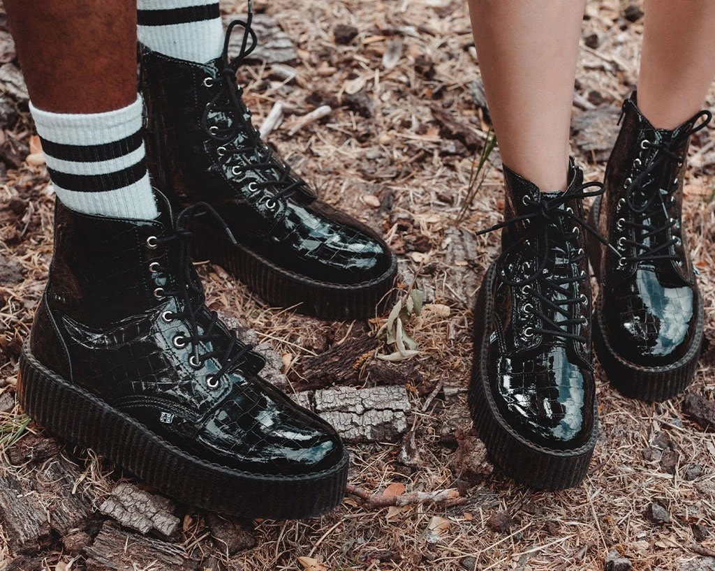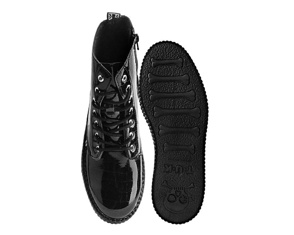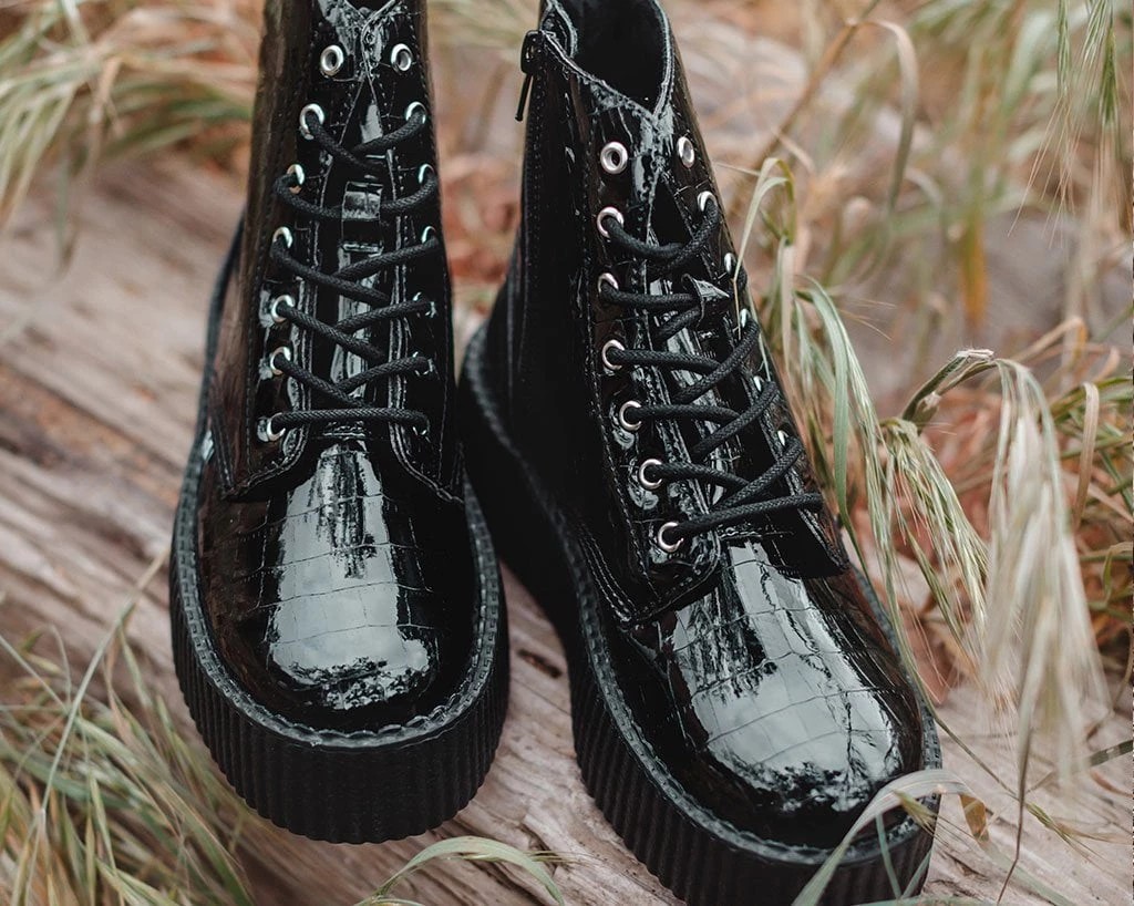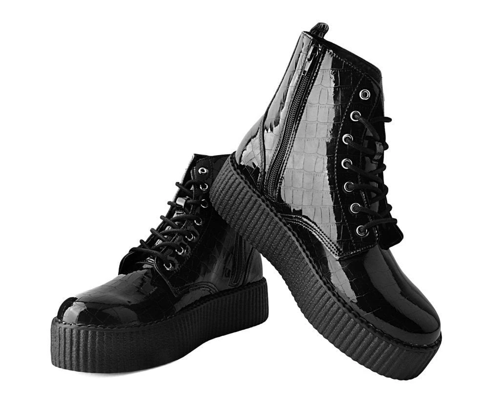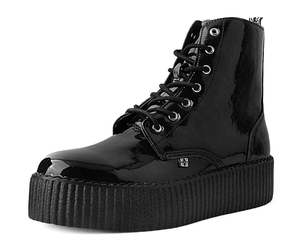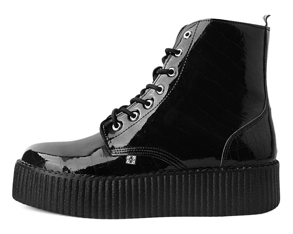 A cold blooded creeper boot. Features a black faux crocodile PU upper. Has a lightweight VIVA mondo sole that is approximately 1 ¾” at the heel and 1 ¼” in the front. Includes a removable memory foam padding for added comfort.