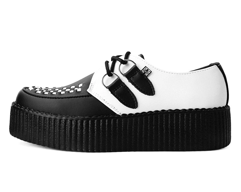 Lets talk two-tone. Has black & white two panel upper made of our high quality TUKskin™ material — polishable synthetic faux leather that is both soft and breathable. Features black woven interlace detailing, lace-up fastening, and our lightweight VIVA mondo sole that is approximately 1 ¾” at the heel and 1 ¼” in the front. Has removable memory foam padding for added comfort. Shoe can be easily cleaned with mild soap and water.