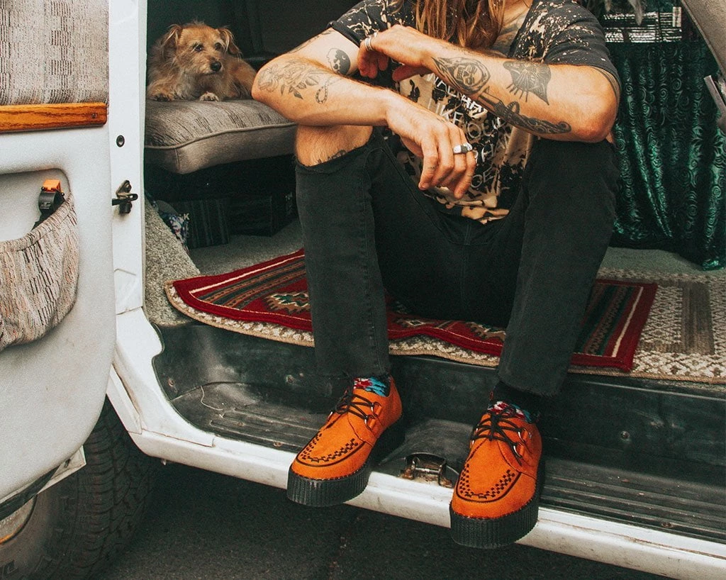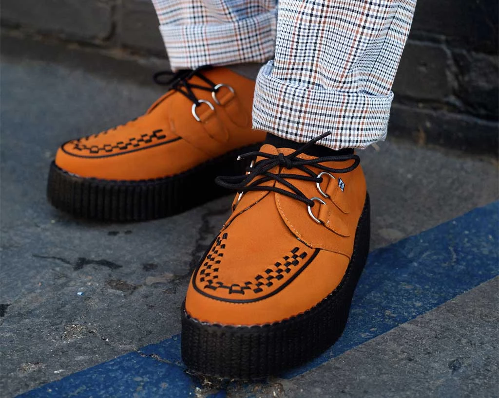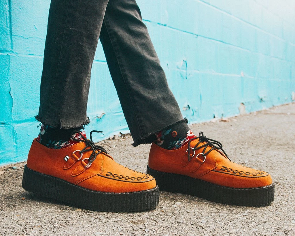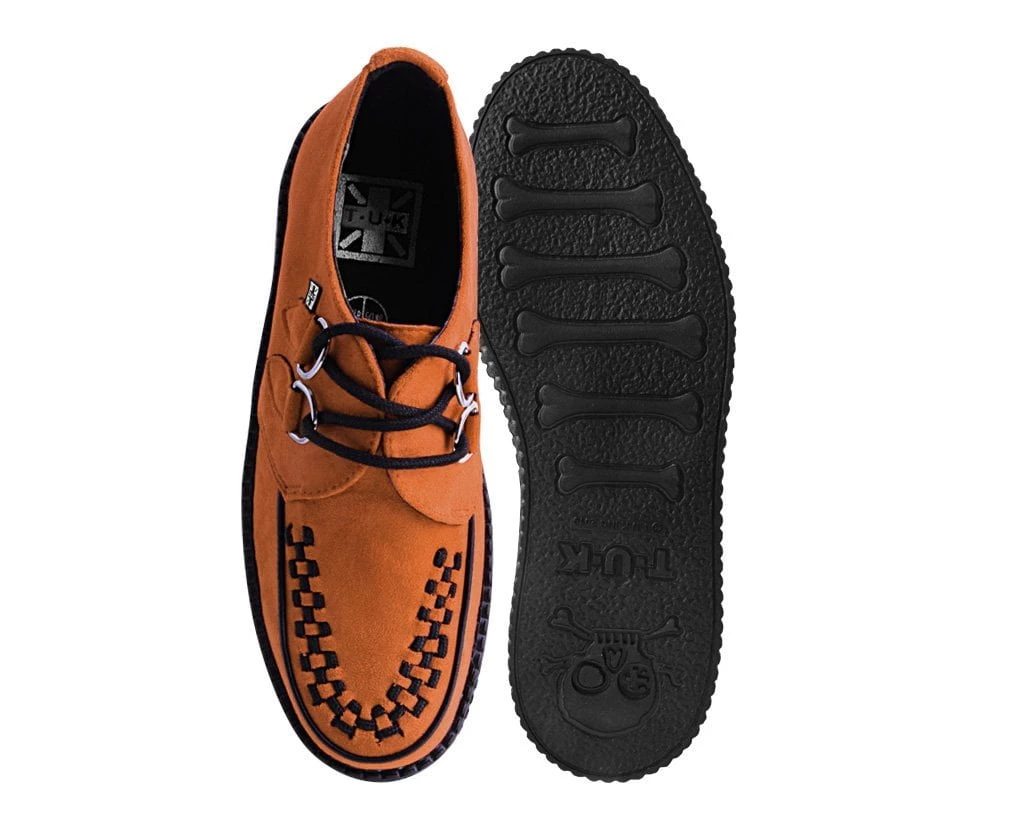 Kick things up a notch in these burnt orange faux suede T.U.K. Viva Mondo Creepers. Our lightweight Viva mondo sole is approximately 1 3/4” at the heel and 1 1/4” in the front. Has removable memory foam insoles for added comfort. These round toe creepers have a black woven interlace, and silver metal D-rings on our patented T.U.K. Skull n’ Bones creeper sole design.