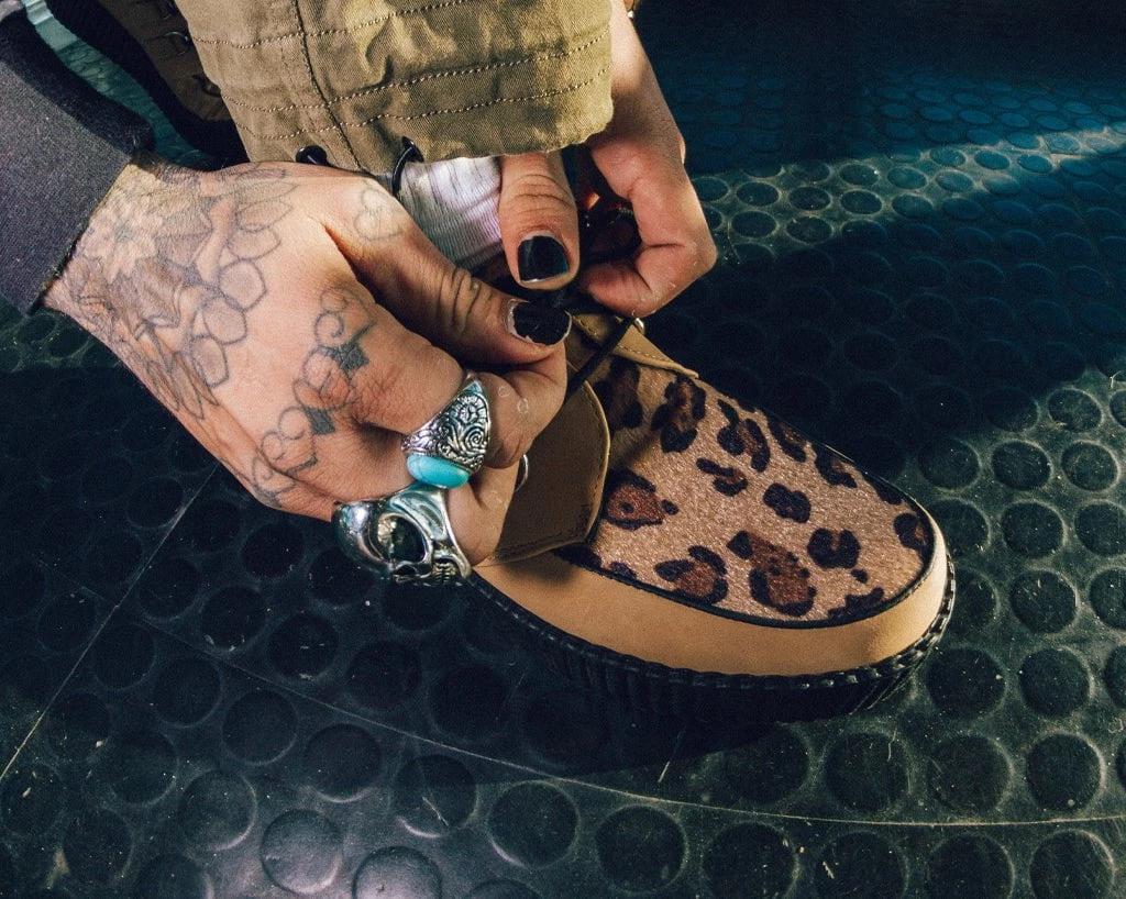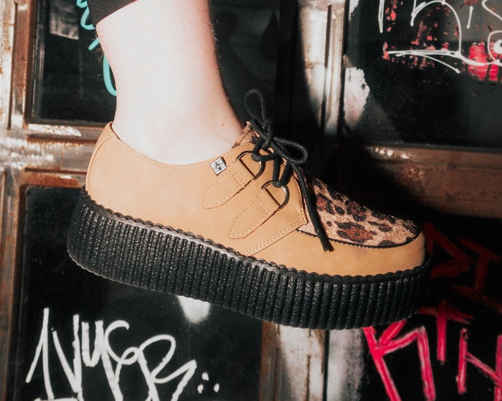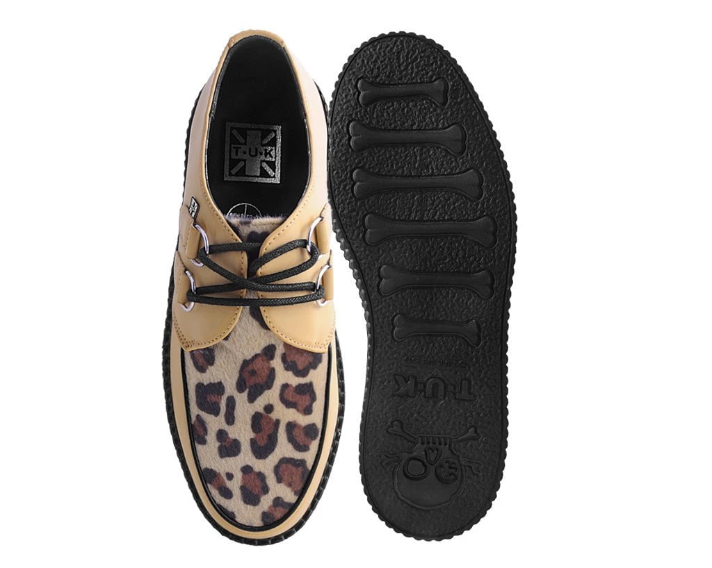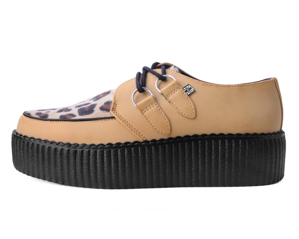 We consider leopard neutral. These vegan creepers have a brown leopard vamp and natural brush off PU upper that is both soft and breathable. Features lace-up fastening and our lightweight VIVA mondo sole that is approximately 1 3/4” at the heel and 1 1/4” in the front. Has removable memory foam padding for added comfort.