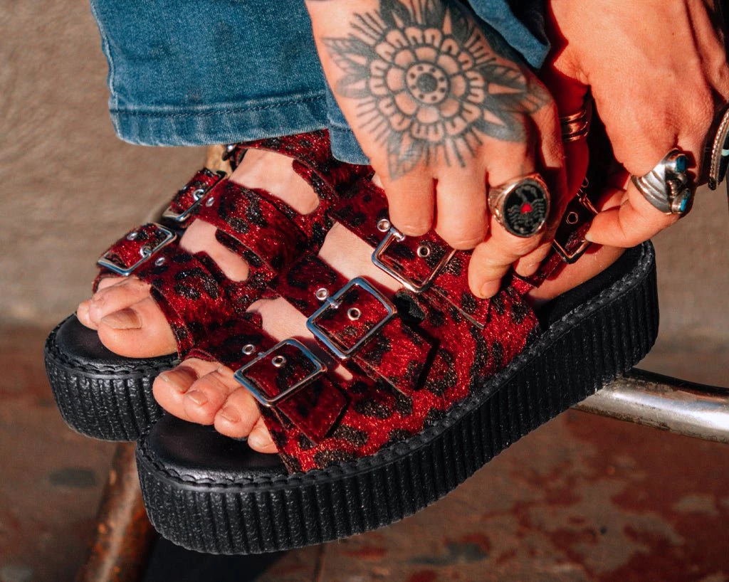 The perfect platform sandal that’ll go with everything. Features a red leopard hair upper, 4 adjustable buckle straps and our lightweight VIVA mondo sole that is approximately 1 ¾” at the heel and 1 ¼” in the front.